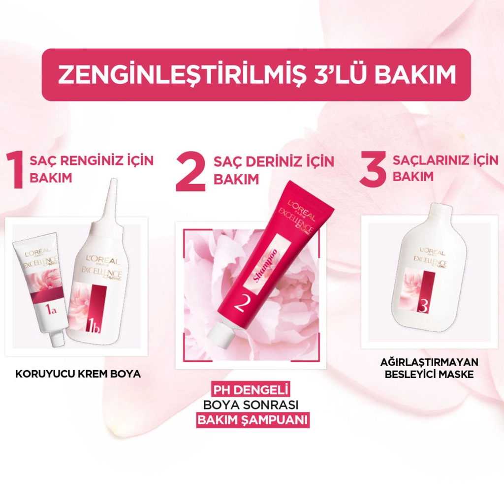 Excellence Creme, beyaz saçları %100 kapatırken saçların daha güçlü ve bakımlı görünmesine yardımcı olur. Hyalüronik Asit ile zenginleştirilmiş özel formülü sayesinde saç tellerine nemi hapseder, boyama sırasında kuruluğu önlemeye destek olur. Geliştirilmiş renk teknolojisi ile daha yoğun ve zengin renk sonucu elde edilirken, saçlar boyama sonrasında bile yumuşaklığını korur. Daha parlak, canlı ve sağlıklı görünen saçlar için boyama deneyimini bakım ile birleştirir.